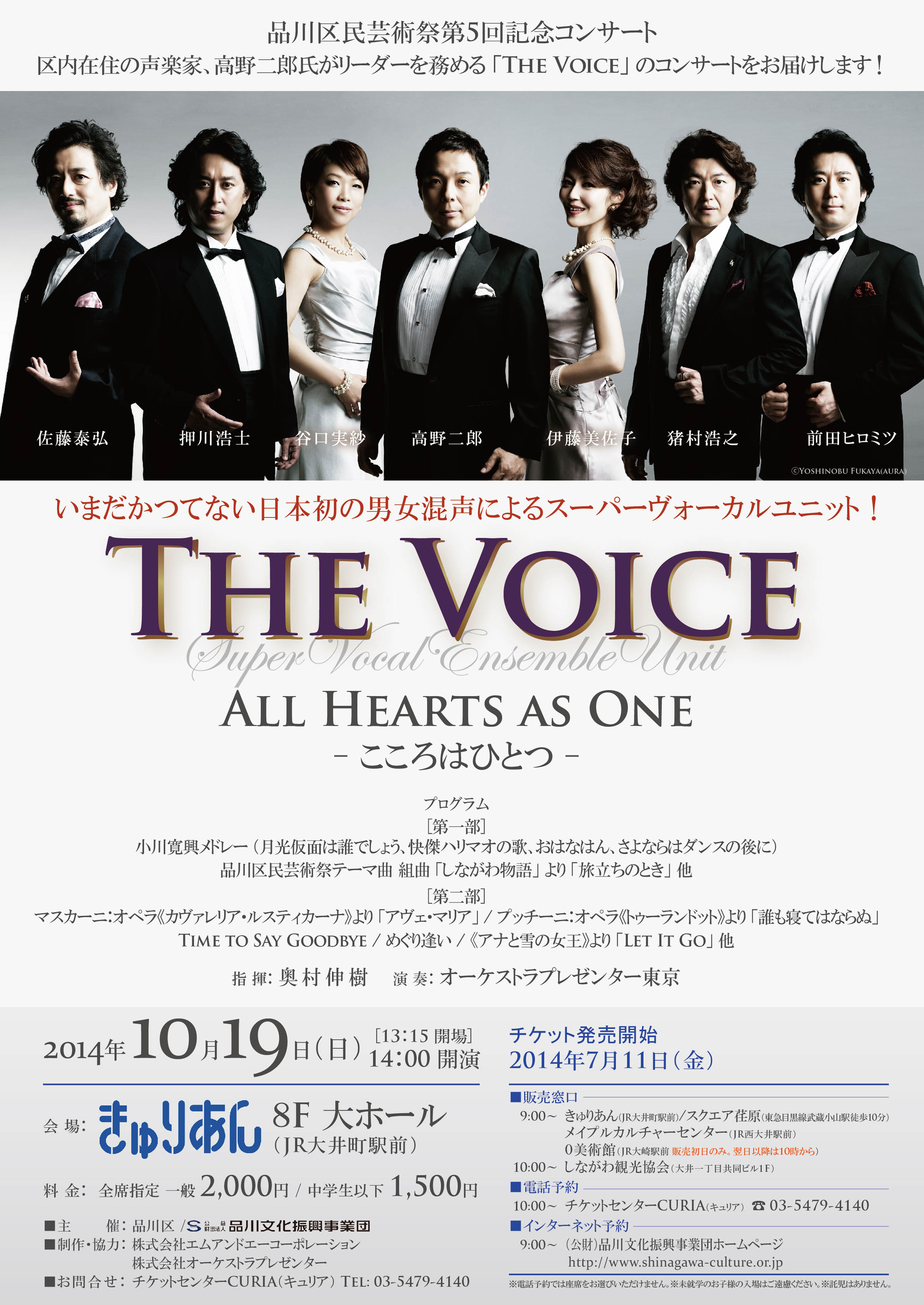 [出演]THE VOICE(高野二郎 / 伊藤美佐子 / 猪村浩之 / 前田ヒロミツ / 谷口実紗 / 押川浩士 / 佐藤泰弘) / 指揮 奥村伸樹 / 演奏 オーケストラプレゼンター東京秋の恒例イベントとなりました「品川区民芸術祭」が5回目を迎え、記念コンサートとして開催しました。