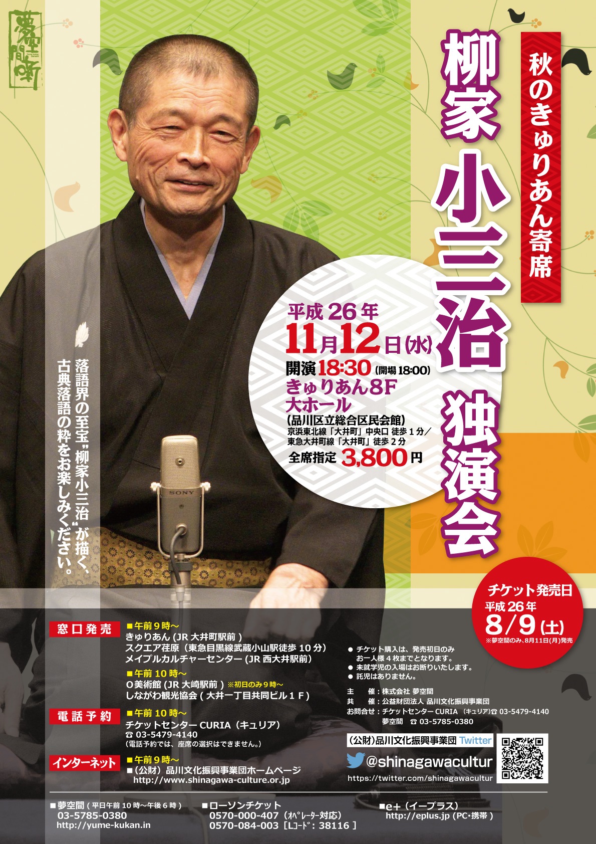 この独演会のチケット発売日直前に小三治師匠が人間国宝の認定を受けた影響もあってか、チケットは瞬く間に完売!プレミアムな公演となりました。