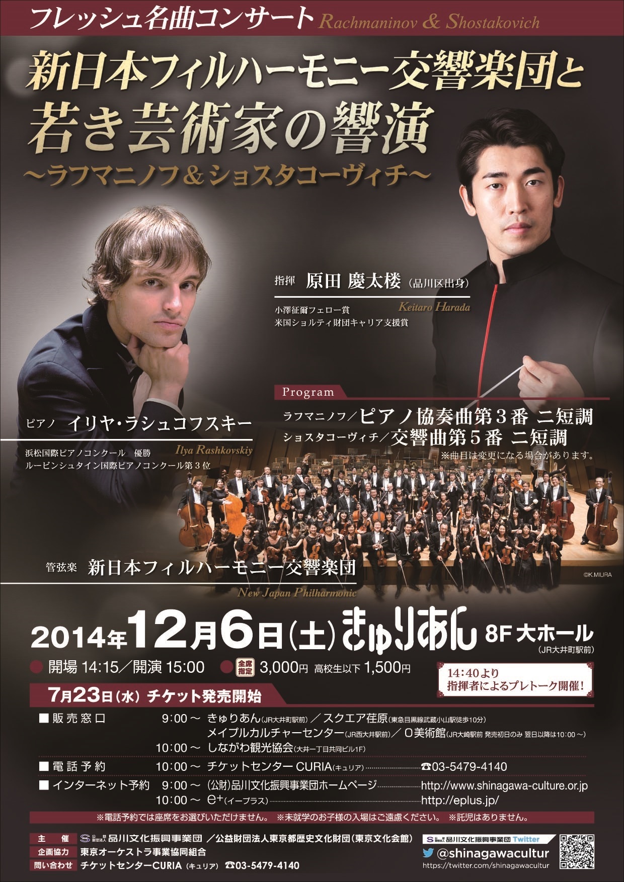 [出演]指揮 原田慶太楼 / ピアノ イリヤ・ラシュコフスキー / 管弦楽 新日本フィルハーモニー交響楽団曲 目 ピアノ協奏曲 第3番 ニ短調 op.30 / セルゲイ・ラフマニノフ カンタータ第208番より『羊たちは安らかに草を食み』/J.Sバッハ/ペトリ編曲 交響曲第5番 ニ短調 op.47 / ドミートリイ・ショスタコーヴィチ 弦楽セレナーデより第2楽章ワルツ / ピョートル・チャイコフスキー 海外で活躍する新進指揮者 原田慶太楼さん(品川区出身)と卓越した技巧で支持される第8回浜松国際ピアノコンクール(2012年)優勝者 イリヤ・ラシュコフスキーさんによるフレッシュ名曲コンサート。