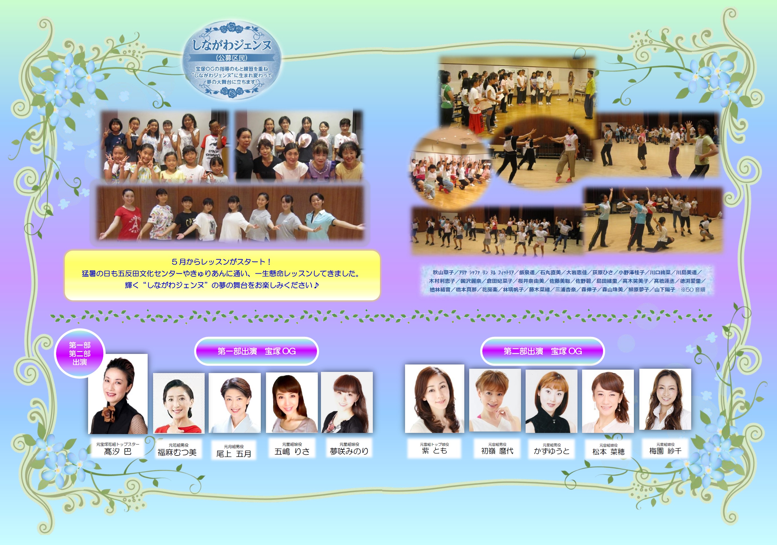 高汐 巴(元花組トップスター・品川区在住)/尾上五月(元月組男役・品川区在住)/福麻むつ美(元花組男役)/五嶋りさ(元星組娘役)/ 夢咲みのり(元星組娘役)/しながわジェンヌ(公募区民)