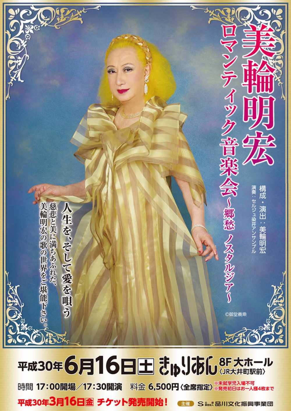 [出演]美輪明宏昭和10年生まれ。「本物の歌い手」として厳しい時代をも生き抜いてこられた美輪明宏さん。神々しいとさえ感じる出で立ちと年齢を感じさせない力強い歌声に、会場は大きな感動に包まれました。