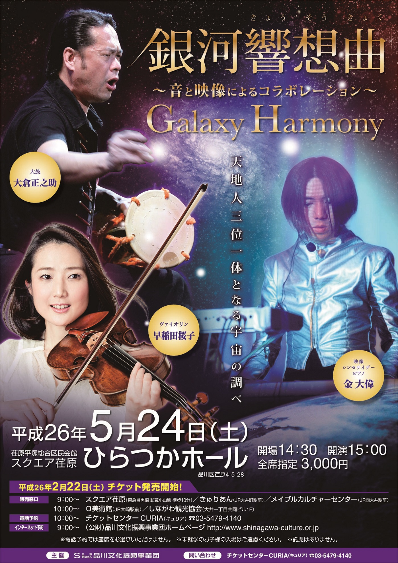 [出演]大鼓 大倉正之助 / ヴァイオリン 早稲田桜子 / 映像・シンセサイザー・ピアノ 金大偉能楽囃子大倉流大鼓 重要無形文化財総合認定保持者の大倉正之助による