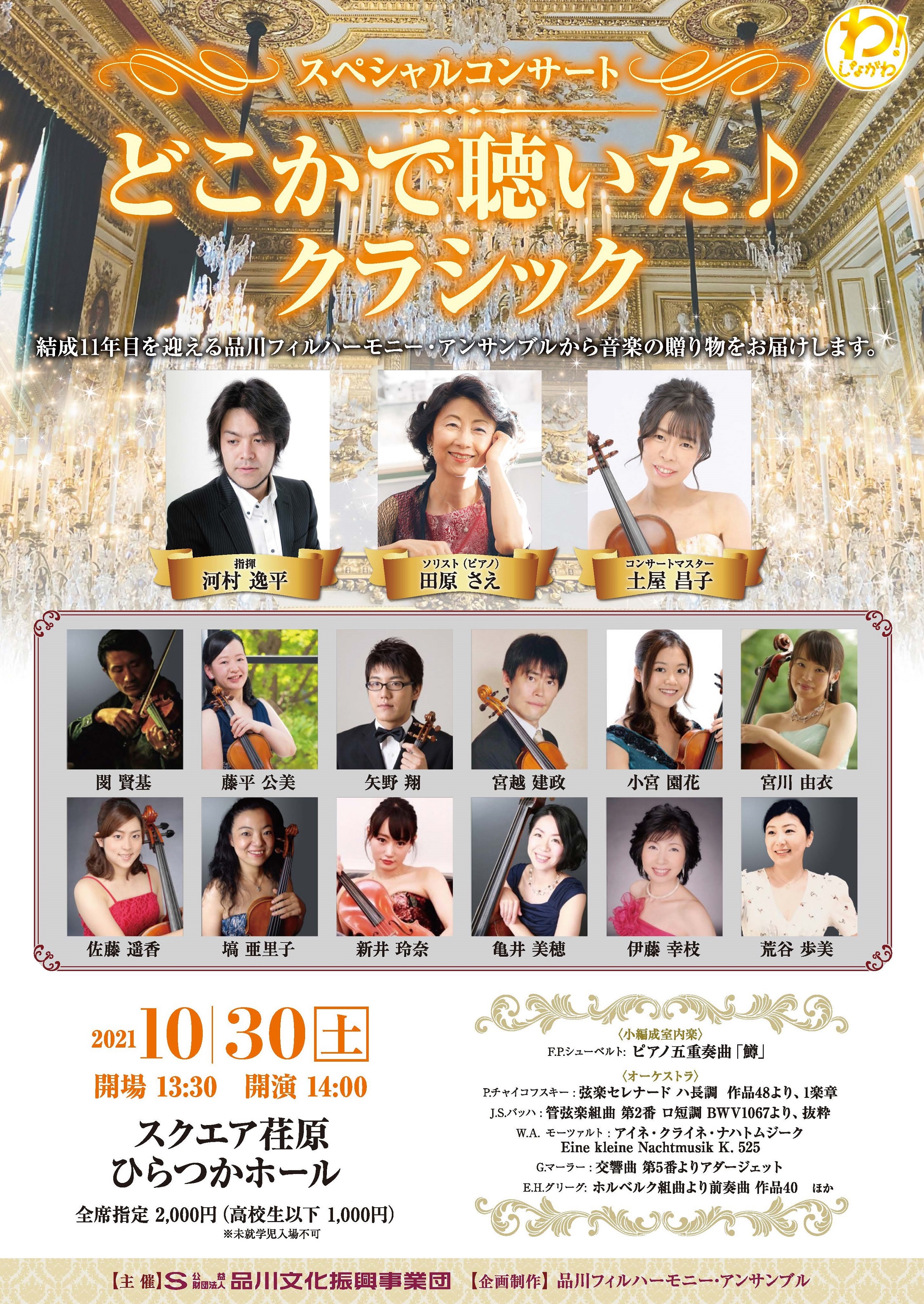 [出演]指揮 河村逸平 / ソリスト(ピアノ) 田原さえ / コンサートマスター 土屋昌子 / 関賢基 / 藤平公美 / 矢野翔 / 宮越建政 / 小宮園花 / 宮川由衣 / 佐藤遥香 / 壇亜里子 / 新井玲奈 / 亀井美穂 / 伊藤幸枝 / 荒谷歩美結成11年目を迎える品川フィルハーモニー・アンサンブルのスペシャルコンサート。