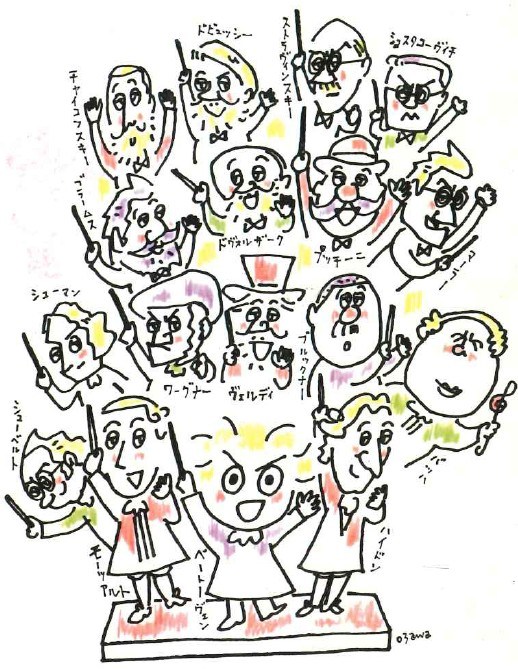 クラシック、ジャズ、ワールドミュージックなどの音楽家の思わずクスッと笑えるような1コマ漫画を中心に描いています。